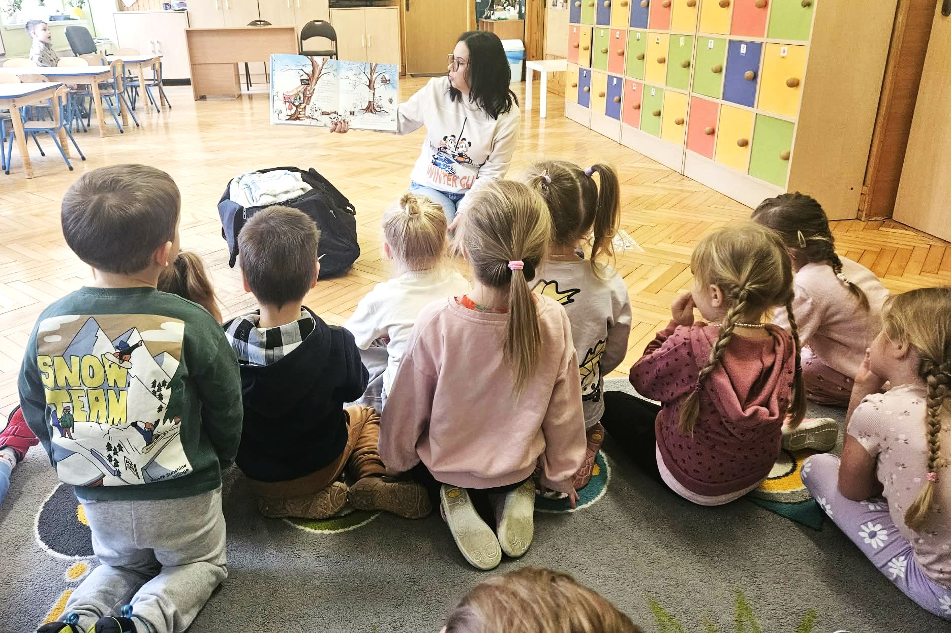 Na zdjęciu widać bibliotekarke czytającą książkę oraz dzieci siedzące i słuchające opowieści.