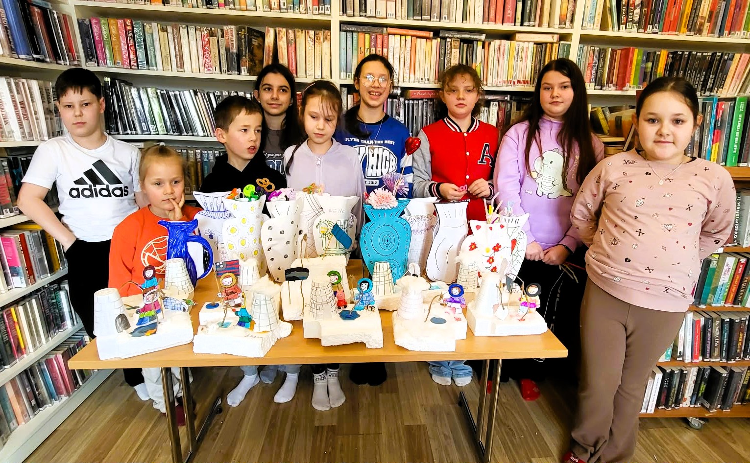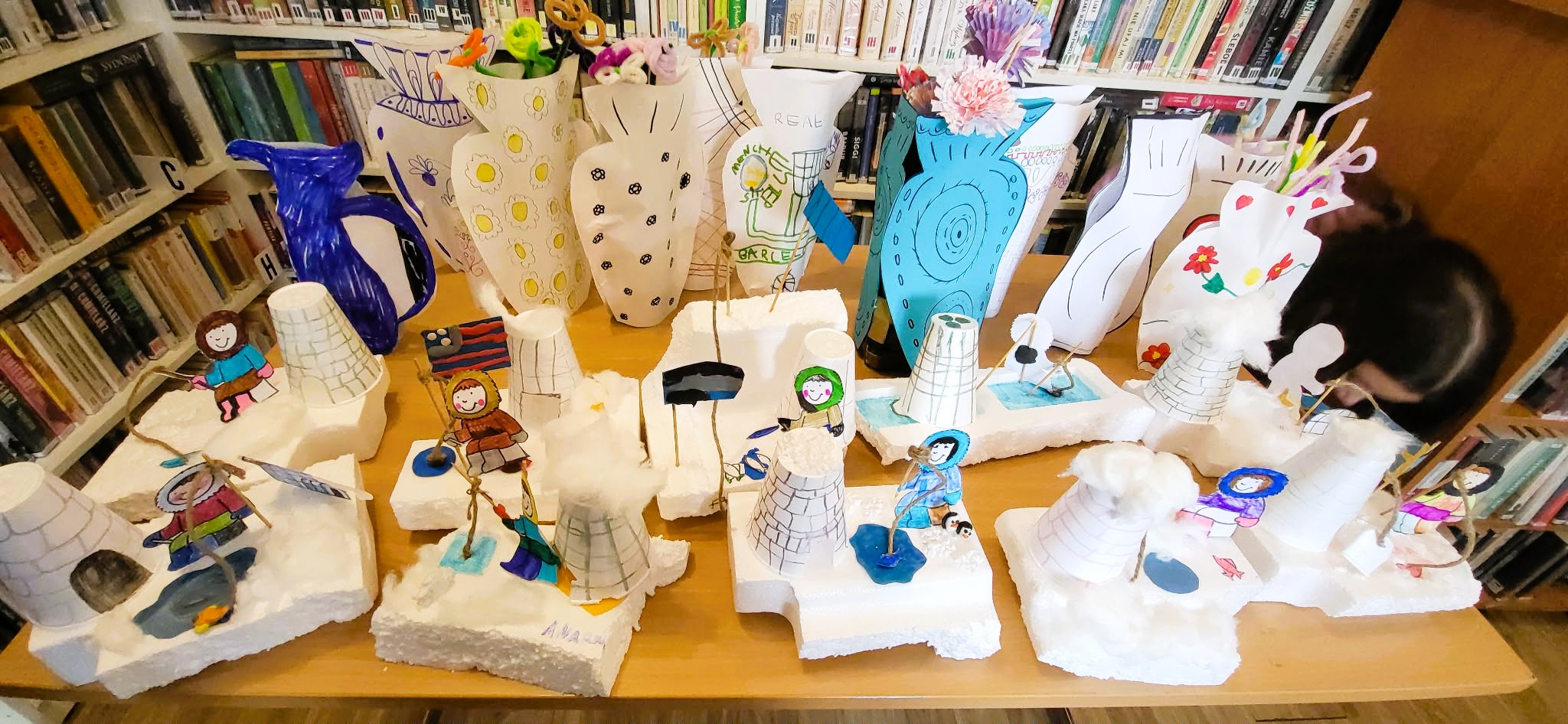 Ferie biblioteczne w Filii1 pomału dobiegają końca ale młodzi czytelnicy nie zwalniają tempa. Tym razem uczestnicy warsztatów wykonali dwie prace plastyczne. Jedna z nich to wesoły Eskimos dryfujący na lodowej krze. Druga to papierowy wazon z fikuśnymi ornamentami. Do wykonania każdego z tych wspaniałych dzieł, dzieci wykorzystały różnego rodzaju "śmieci" takie jak np. plastikowe butelki czy styropianowe odpady. Dlaczego? bo kreatywny recykling to jest to co lubimy najbardziej.