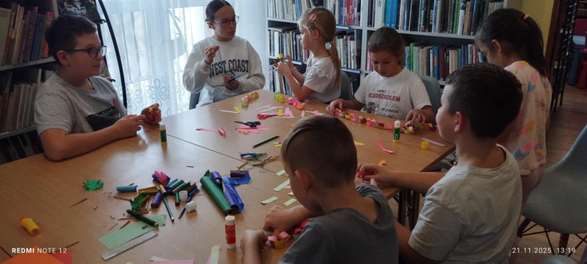 21 listopada 2025 r. nasza biblioteka zamieniła się w prawdziwą pracownię świątecznej magii! Podczas wyjątkowych warsztatów przygotowywaliśmy prace na konkurs „Z gwiazdą i z turoniem”, a kreatywność dzieci przerosła wszelkie oczekiwania. Wspólnie z panią Agatą Broniszewską z Centrum Kultury w Krynicy-Zdroju oraz z uczestnikami PWD „Przystań” tworzyliśmy ozdoby, które nie tylko pięknie wyglądają, ale także nawiązują do naszych regionalnych tradycji. Dzieci z zaangażowaniem i uśmiechem na twarzach przygotowały m.in.: kolorowe papierowe łańcuchy, misternie wykonane pajączki z bibuły, urocze szyszki z bibuły,