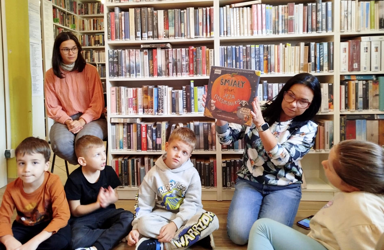 W czwartek, 25 września bibliotekę na Czarnym Potoku odwiedziły dzieci z Niepublicznego Przedszkola Integracyjnego "Przystań" w Krynicy- Zdroju po to aby odczarować jesień. Były więc jesienne rymowanki, jesienna pantomima i zamykane w słoiku dary jesieni. Przedszkolaki zamieniły się w malarzy i pomogły Pani Jesieni pomalować liście. Oczywiście nie mogło zabraknąć książki. Tym razem starszaki wysłuchały opowieść pt."Śmiały plan Jeża Nieśmiałka" autorstwa Katy Hudson. To bardzo ciepła i pięknie ilustrowana historia o nieśmiałym jeżyku, który postanawia zbudować dom z dyni. Niestety jego nieśmiałość przeszkadza mu w tym aby prosić kogoś o pomoc. Na szczęście udaje mu się przełamać swoje opory i wszystko kończy się dobrze. Jeżyk nie tylko buduje nowe i piękne schronienie ale przede wszystkim zdobywa nowych przyjaciół.