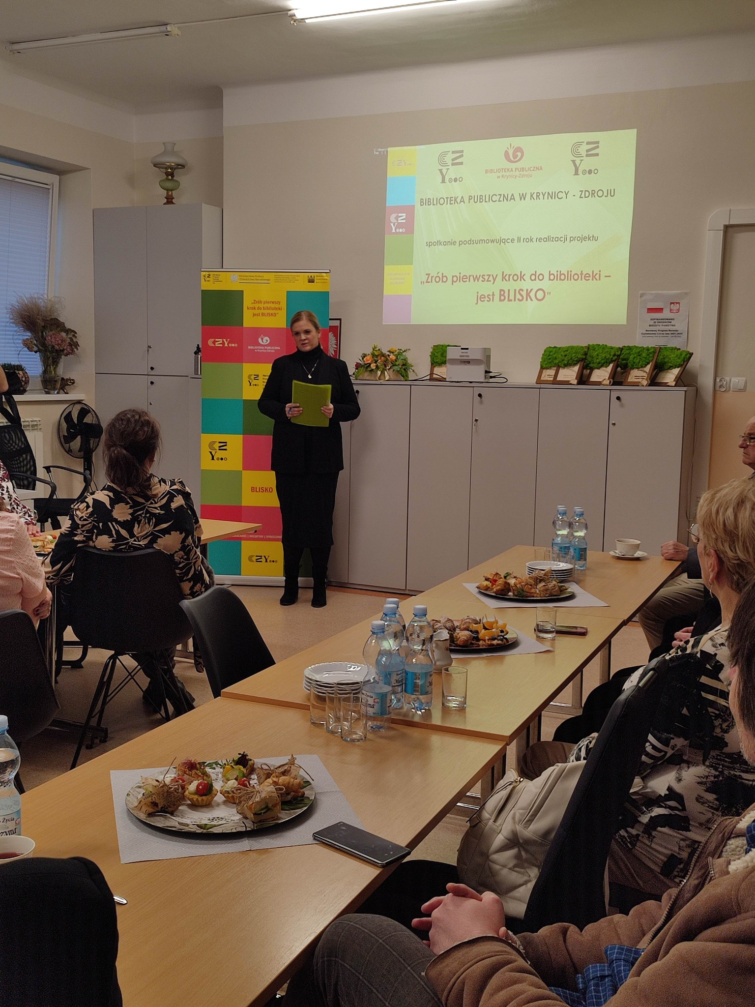 Przyszedł też czas na podsumowanie, szczególnie działań, które odbyły się w drugim roku realizacji. Na spotkanie podsumowujące projekt „Zrób pierwszy krok do biblioteki – jest BLISKO” biblioteka zaprosiła przedstawicieli władz, partnerów projektu, stowarzyszeń oraz autorów pomysłów na Inicjatywy Lokalne. W spotkaniu uczestniczyła pani Maria Lelito, Przewodnicząca Rady Miejskiej, radny Jan Boligłowa, partnerów projektu reprezentowali: Beata Kandler z Uniwersytetu III wieku, Zyta Turek i Władysław Sady, członkowie Zarządu Stowarzyszenia Miłośników Krynicy, Tomasz Szczotka i Halina Sternal – przedstawiciel krynickich seniorów. Byli też obecni zwycięzcy konkursu na Inicjatywy Lokalne : Stowarzyszenie Miłośników Małej Ojczyzny Berest - pani prezes Teresa Rucka i wiceprezes Jolanta Nowak oraz Małgorzata Duło z nieformalnej grupy osób z osiedla Źródlana.