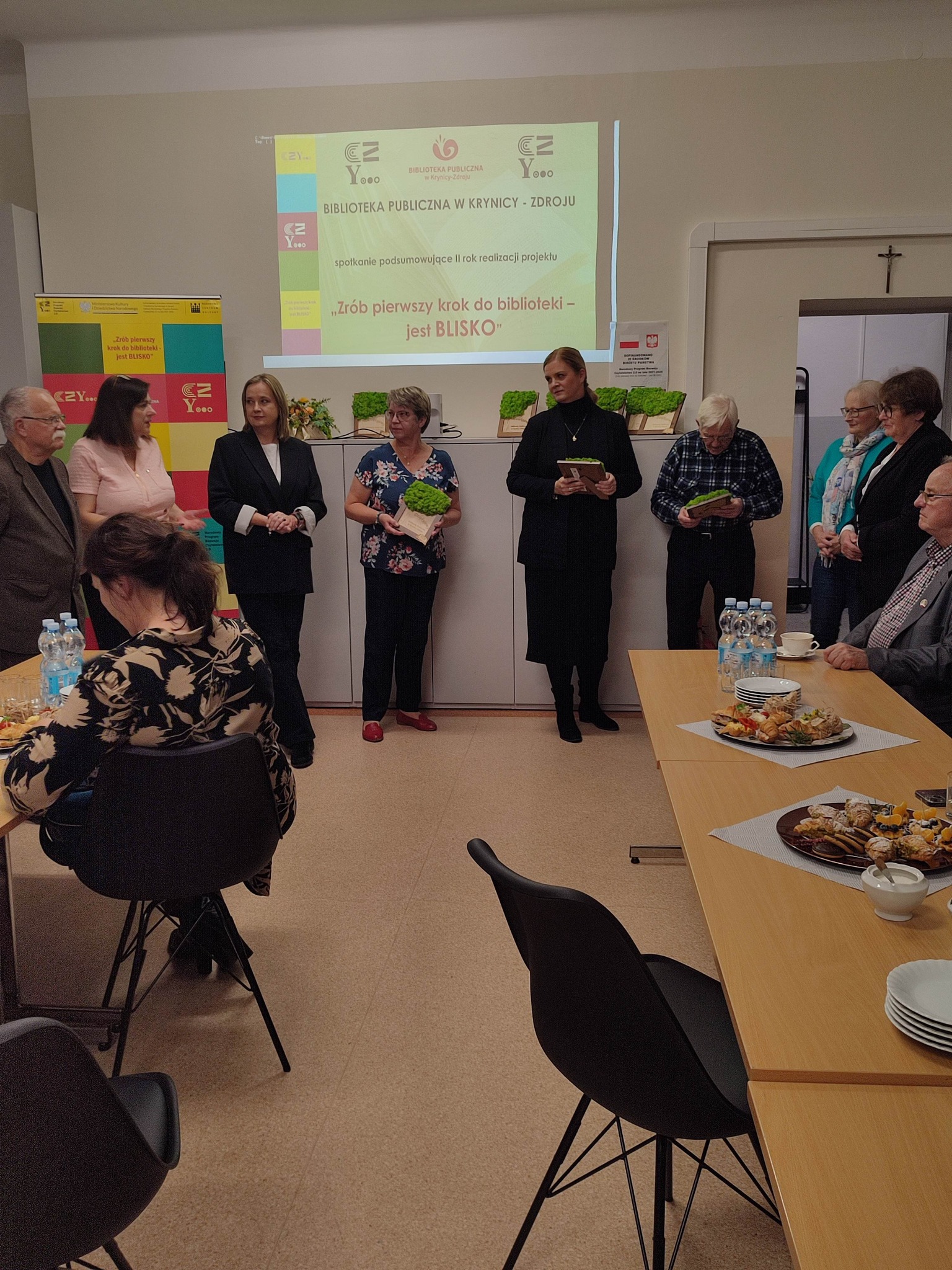 Pani Dorota Jaśkiewicz, dyrektor Biblioteki Publicznej w Krynicy – Zdroju krótko podsumowała dwa lata pracy podając najważniejsze statystyki projektu za 2024 i 2025 rok: 40 wydarzeń, w których wzięło udział ok. 1 tys. uczestników, w tym 4 inicjatywy lokalne – zgłoszone przez czytelników, 8 szkoleń, 3 wizyty studyjne. Tylko na samo przygotowanie wymienionych przedsięwzięć poświęcono co najmniej 200 godzin pracy. Spotkanie było też okazją do podziękowania – partnerom projektu oraz osobom, które szczególnie angażowały i wspierały bibliotekę w realizacji. Dla nich zostały przygotowane specjalne zaprojektowane statuetki - w formie ramek.
